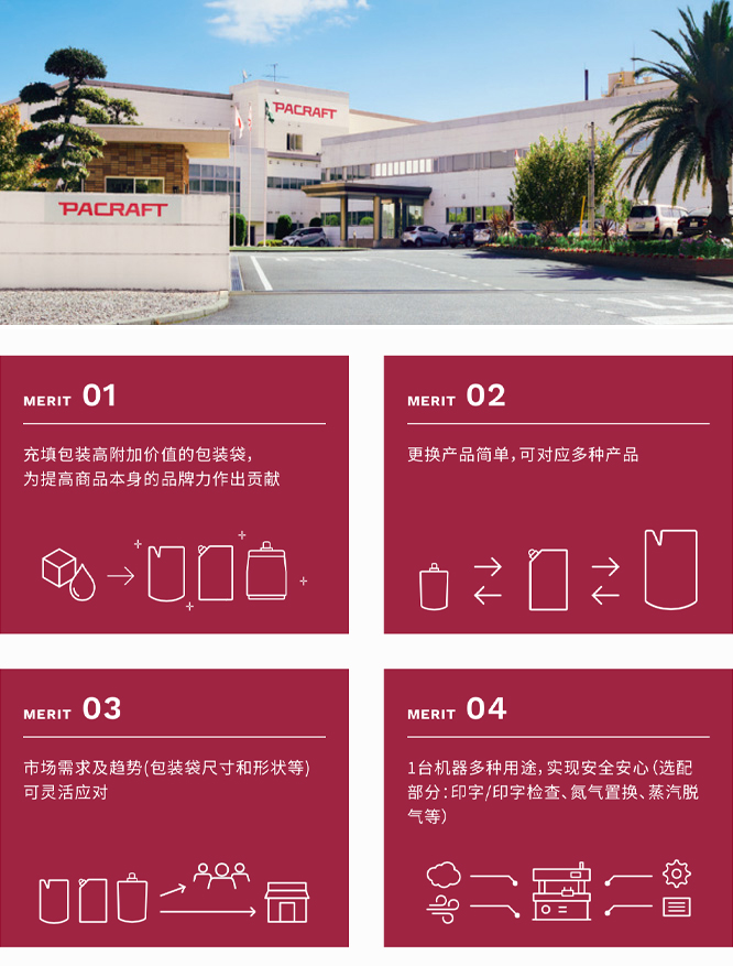 PACRAFT株式会社是生产计量、充填包装机械以及各种综合包装系统的先进企业,自1960年创业以来,我们不断地进行产品的技术研发,并为促进新时代饮食文化的发展而不懈努力。例如现代生活中常见的蒸煮袋食品的问世,便是这些努力的结晶之一,为了对应此类产品的包装,PACRAFT于1963年成功研发了日本首台转盘式包装机,其正是我们高端技术的产物。在此基础上,在洗发液、洗涤剂、化妆品等各类生活用品的包装领域,也都有我们技术的贡献 。